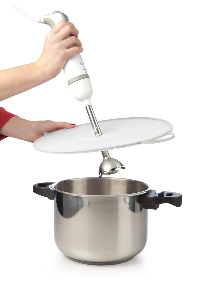 Silikonové víko lze použít jako univerzální kryt ke šlehání. Silikonové víko má otvor pro metly či ponorný mixér, víko zabrání tekutině či těstu, aby při mixování stříkalo mimo nádobu a všude tak zůstane pořádek. Zároveň lze silikonové víko použít jako univerzální pokličku na hrnec, pánev nebo mísu.