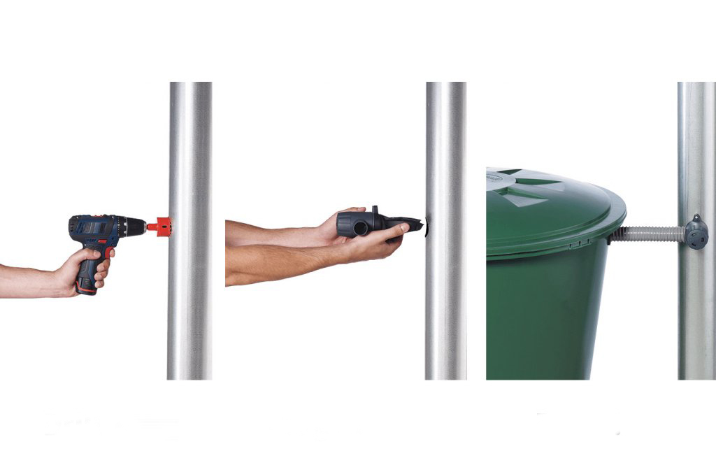 • Kompletní instalační sada: V balení naleznete vše potřebné pro instalaci na okap i pro připojení k nádrži: korunový vrták pro vytvoření otvoru v okapu i v nádrži, těsnění a 50 cm flexibilní hadici s 32 mm (1 1/4) připojením k sudu. Sud není součástí balení.