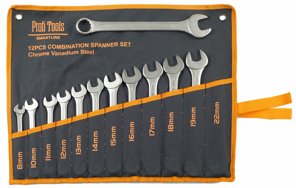 12ti dílná sada očkoplochých klíčů 8 - 22 mm pro široké uplatnění doma či profesionálních dílnách. Klíče jsou z jedné strany ploché otevřené, z druhé strany je dvanáctihranné očko.